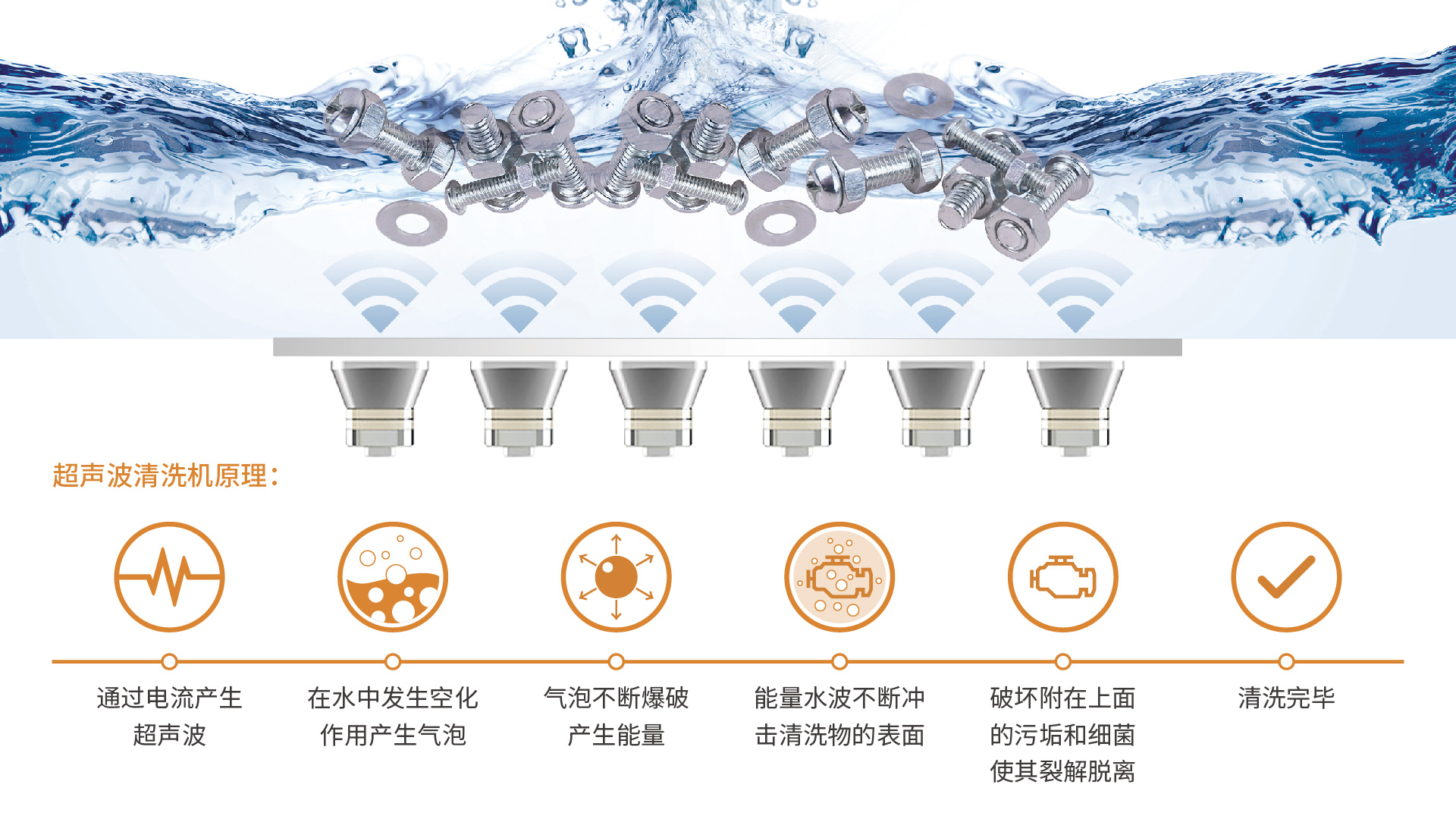 超声波清洗的原理是通过高频超声波振荡产生微小的气泡,气泡在液体中迅速扩大、收缩,产生强烈的冲击力和剪切力,将污垢、油脂等物质从被清洗物体表面或内部彻底清除。