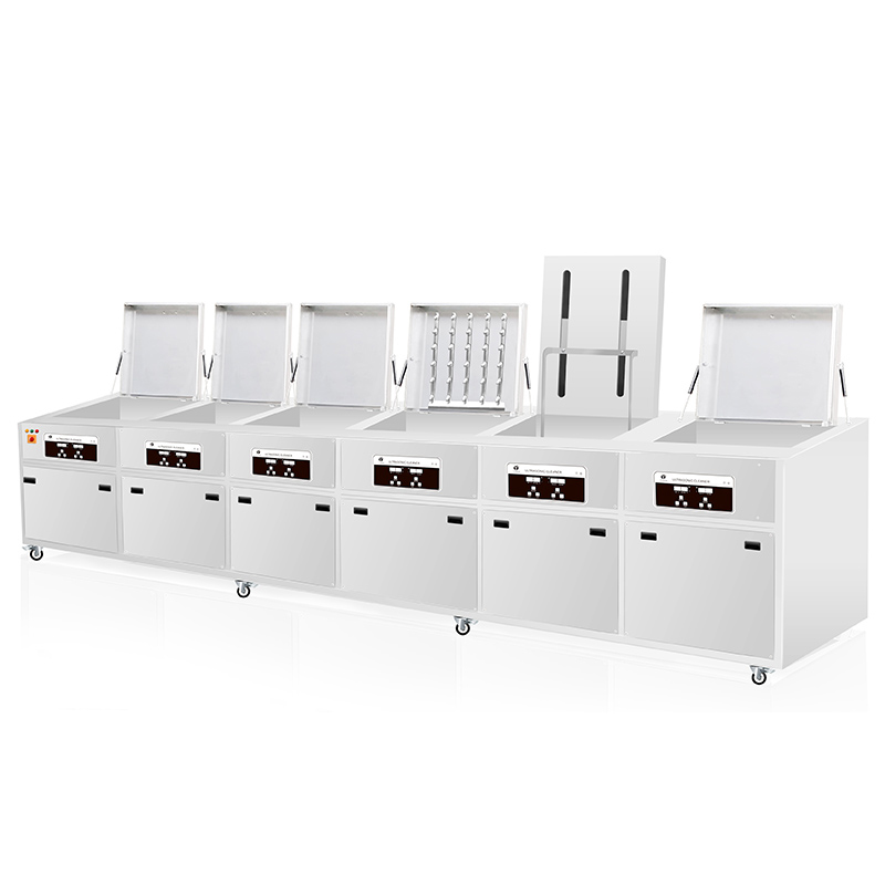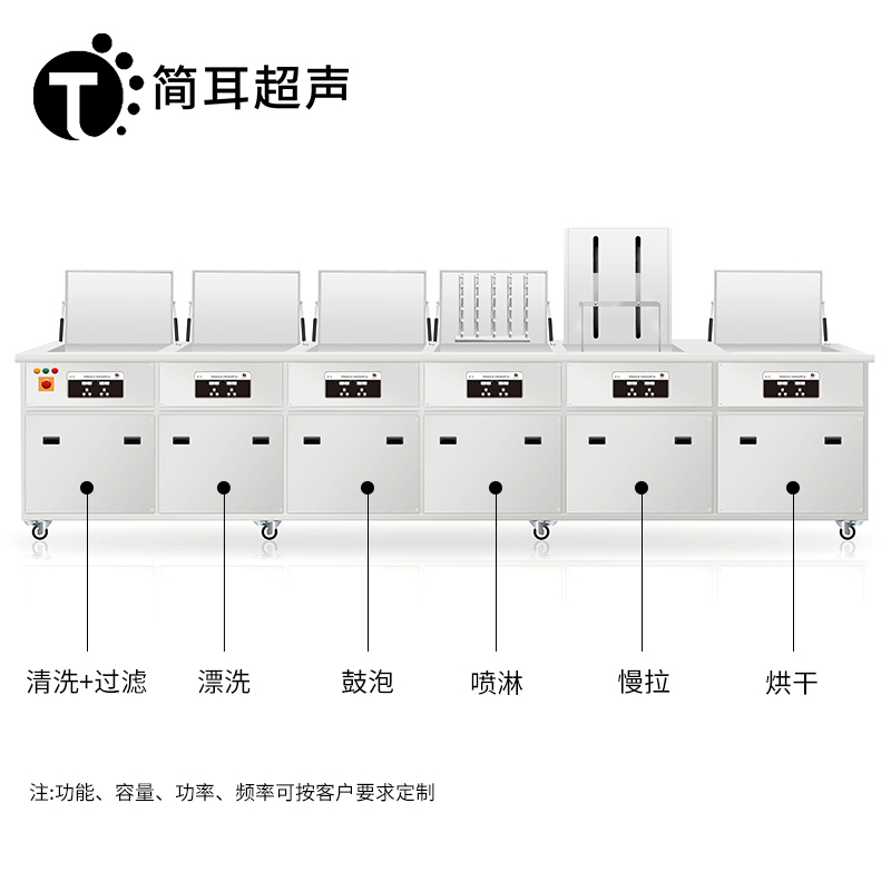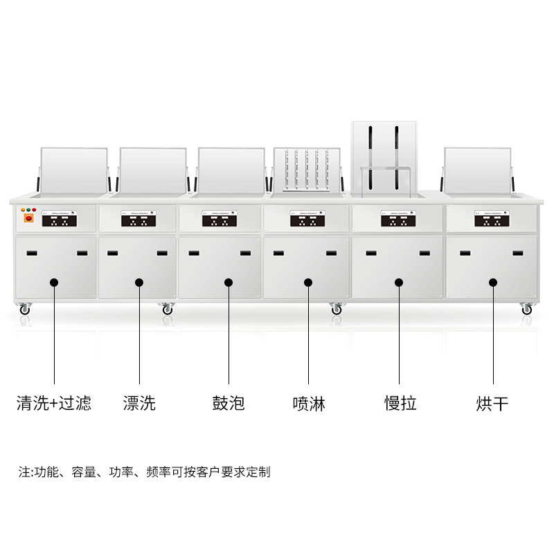 工艺流程:1#超声波粗洗+过滤,2#超声波漂洗,3#鼓泡漂洗,4#喷淋漂洗,5#慢拉脱水,6#热风循环烘干